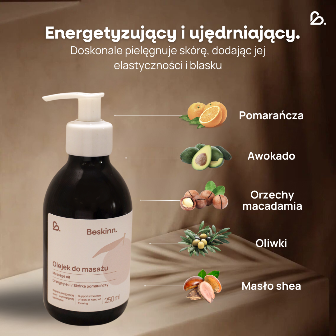 Olejek do masażu od Beskinn to starannie dobrana kompozycja naturalnych składników, które kompleksowo dbają o skórę. Olej ze skórki pomarańczy pobudza mikrokrążenie, wspomagając redukcję cellulitu i detoksykację. Olej z orzechów macadamia intensywnie nawilża i poprawia elastyczność skóry, a olej z awokado głęboko odżywia i regeneruje. Dodatek oleju jojoba wzmacnia barierę ochronną skóry, zapewniając jej długotrwałe nawilżenie. Masło shea koi i wygładza skórę, sprawiając, że staje się aksamitnie miękka, a oliwa z oliwek bogata w antyoksydanty, chroni przed przesuszeniem i wspomaga proces regeneracji. Dzięki tej unikalnej formule olejek nie tylko pielęgnuje, ale również nadaje skórze jędrność i zdrowy blask.