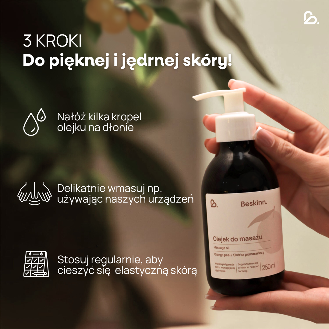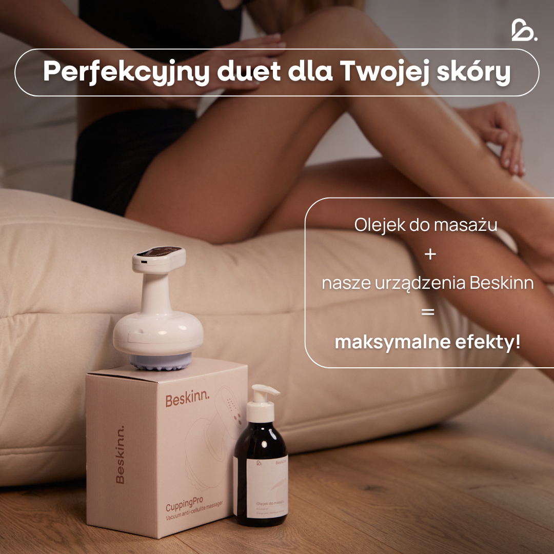 Połączenie olejku do masażu Beskinn i naszych urządzeń do masażu to skuteczny sposób na jędrną, nawilżoną i gładką skórę. Olejek intensywnie odżywia i wspomaga regenerację, a urządzenie stymuluje mikrokrążenie, redukuje cellulit i poprawia elastyczność skóry. Regularne stosowanie tego duetu pozwala uzyskać maksymalne efekty pielęgnacyjne, zapewniając Twojej skórze zdrowy wygląd i aksamitną miękkość. Odkryj luksus domowej pielęgnacji z Beskinn!