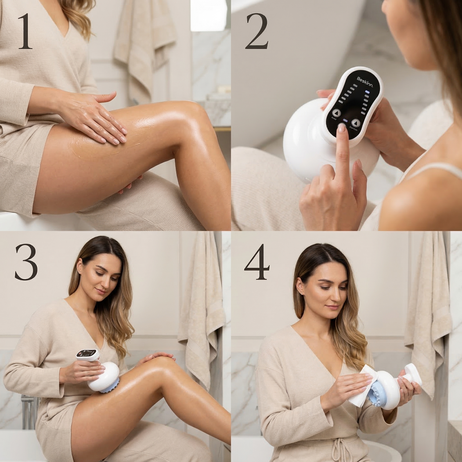 Przesuwaj masażer po skórze szybkimi, płynnymi ruchami. Nie zatrzymuj w jednym miejscu, by uniknąć siniaków.